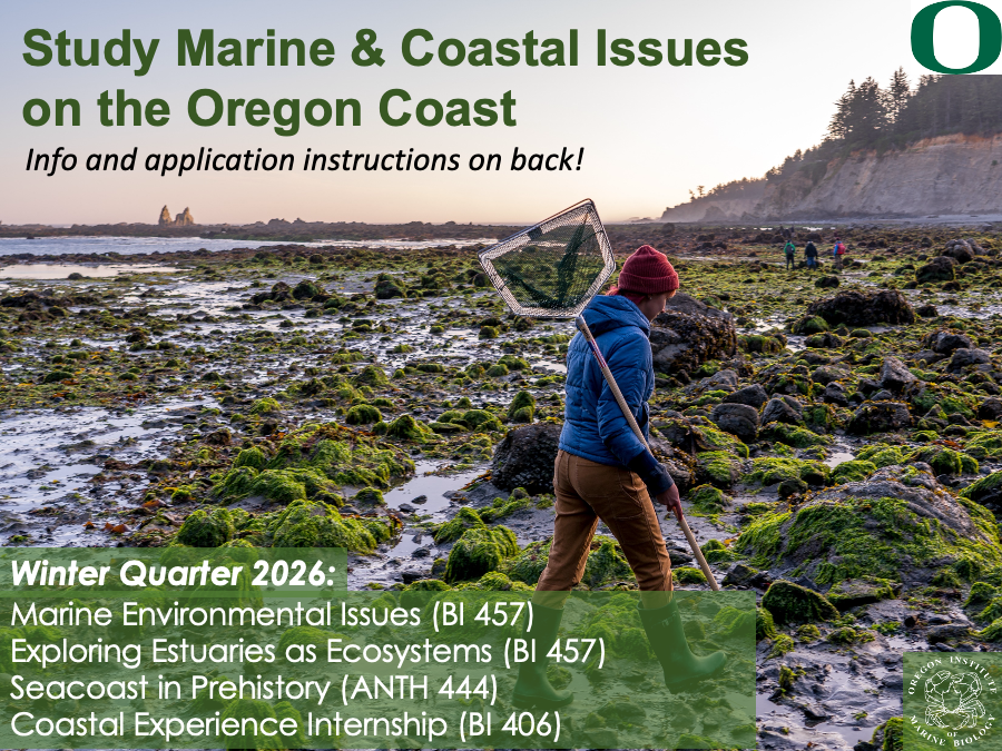 Spend a winter term at the coast, immersing yourself in life along Oregon’s rocky shores, exploring tidepools or estuarine environments. The Oregon Abroad: Coastal Environments is a new, interdisciplinary program for undergraduates that uses UO’s marine station (Oregon Institute of Marine Biology) in Coos Bay, OR, as a base to learn about coastal environmental issues, receive hands-on instruction in data collection and analysis, improve your science communication skills, and more! This program is open to all majors and we encourage you to talk to your academic advisors about how the courses can satisfy specific requirements.
