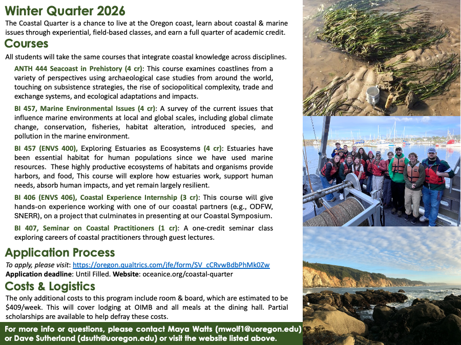 Please contact Maya Watts (mwolf1@uoregon.edu) or Dave Sutherland (dsuth@uoregon.edu) with questions. A set of Frequently Asked Questions (FAQ) is below. The images below show the Oregon Abroad: Coastal Environments Flyer for Winter 2025.
