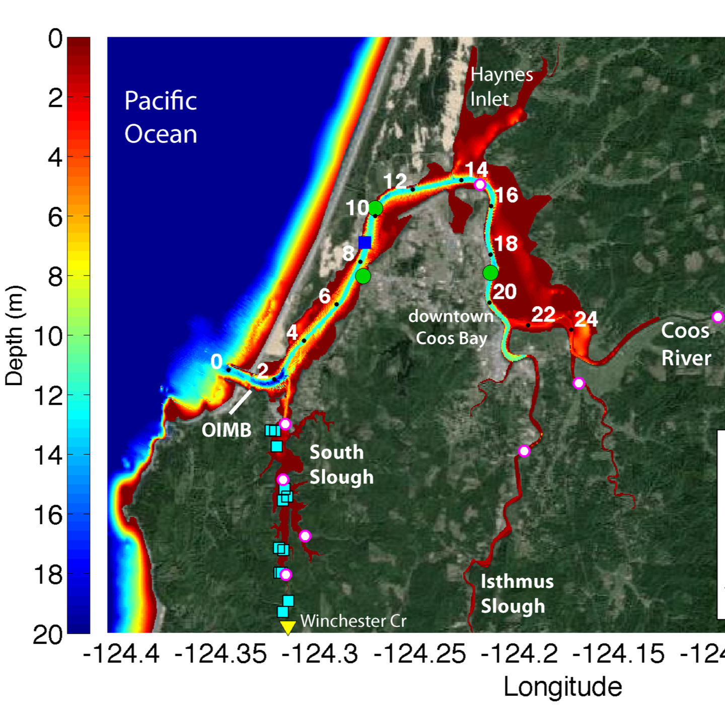 The Coos estuary in southern Oregon encompasses the South Slough National Estuarine Research Reserve, the towns of Coos Bay and North Bend, and the marine lab of UO, the Oregon Institute of Marine Biology (OIMB). We study the dynamics of this small, seasonal estuary from to integrate many processes, such as larval movement, sediment transport, upwelling intrusions, and exchange flow.